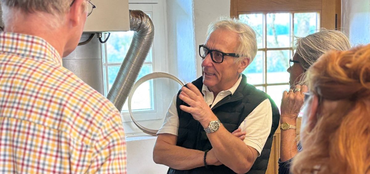 Manfred Jehle erklärt das Trommelröstverfahren an der Maschine.